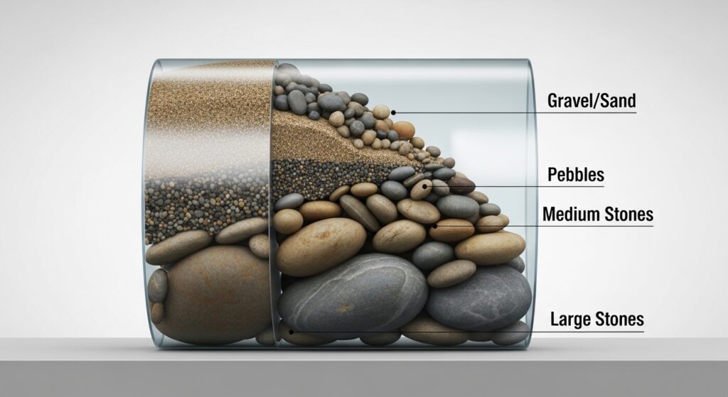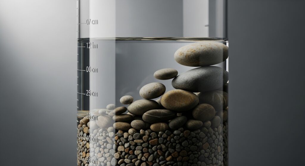 المخبار المدرج هو وعاء أسطواني طويل مصنوع غالباً من الزجاج القوي أو البلاستيك الشفاف، ويحتوي على خطوط مرقمة بدقة (تدريجات). نستخدمه لأننا لا نستطيع قياس أبعاد الحجر بالمسطرة، فالحجر ليس مربعاً كاملاً أو دائرة مثالية. هنا يأتي دور حجم الحجر داخل المخبار؛ حيث يعمل السائل داخل المخبار كأداة قياس ذكية تحتضن الحجر من جميع الجهات لتعطينا قراءة دقيقة جداً لا يمكن للمسطرة توفيرها.